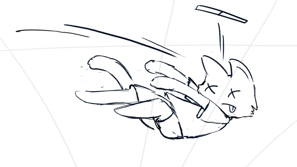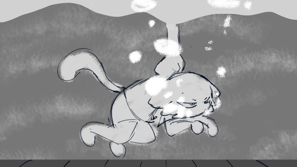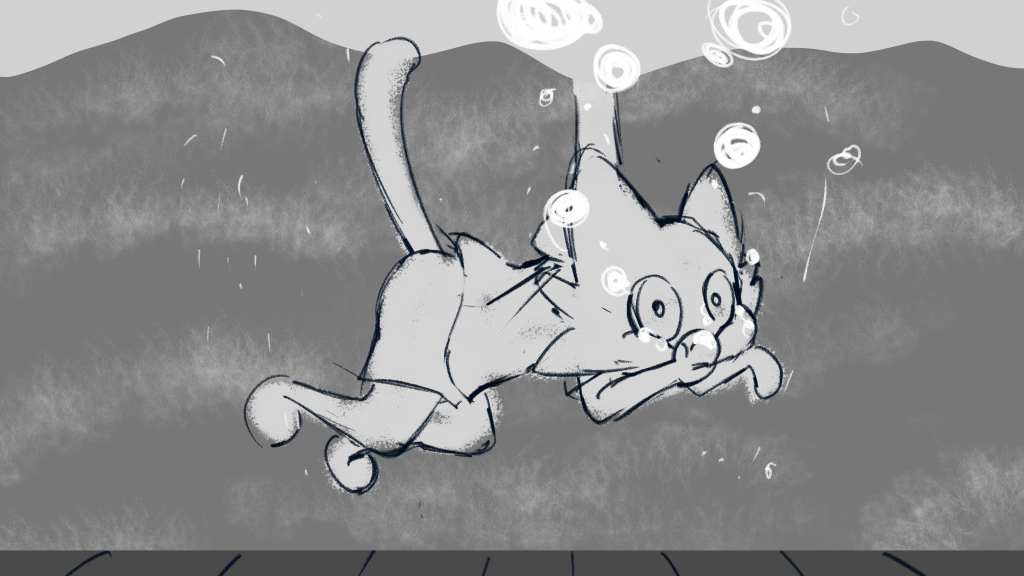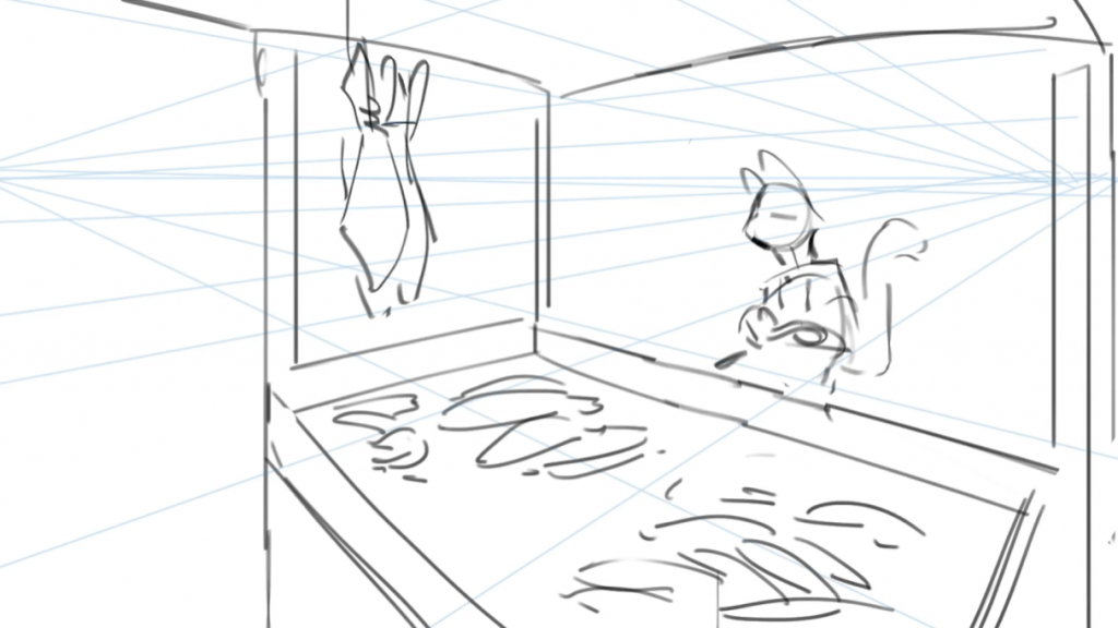 Back to the background, that’s a very good perspective. But considering next shot the cat falls from the right side, to match the focus of audience’s eyes, I mirrored John’s draft.