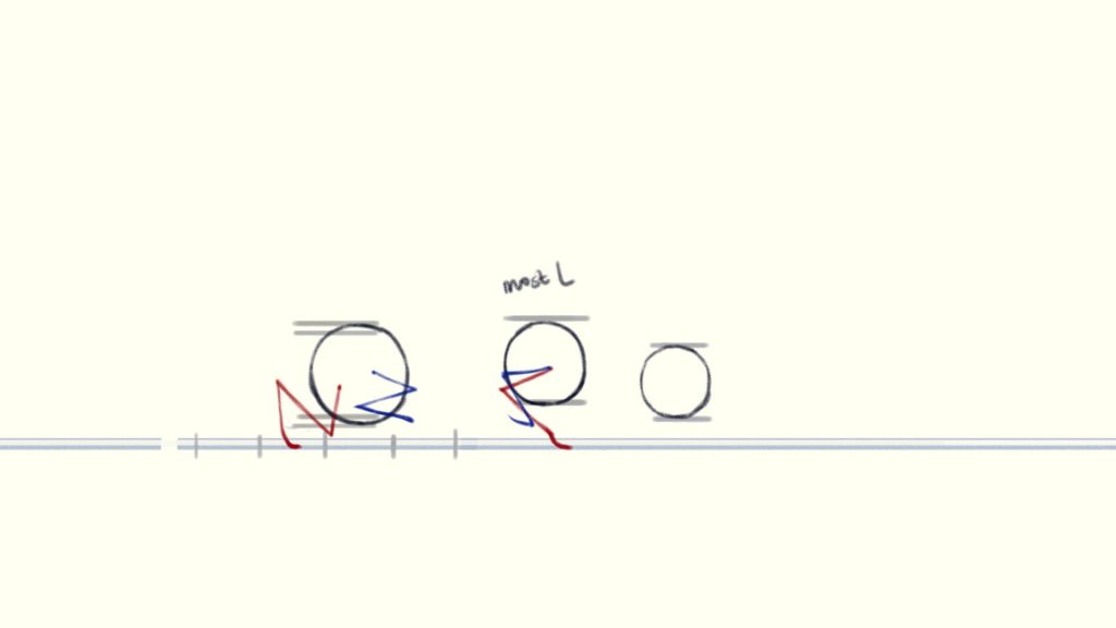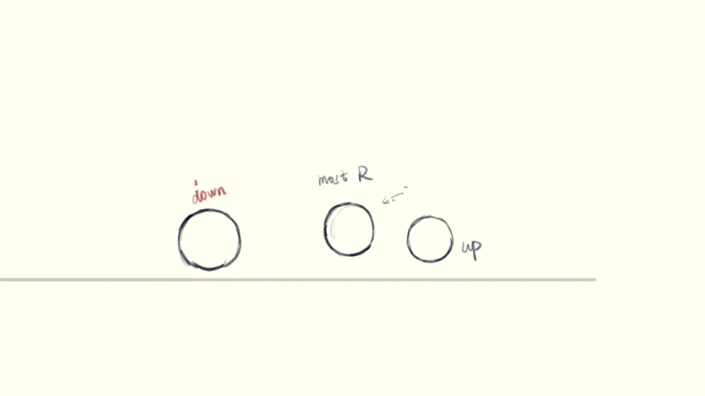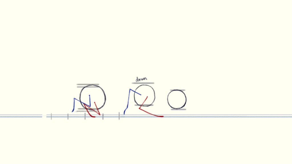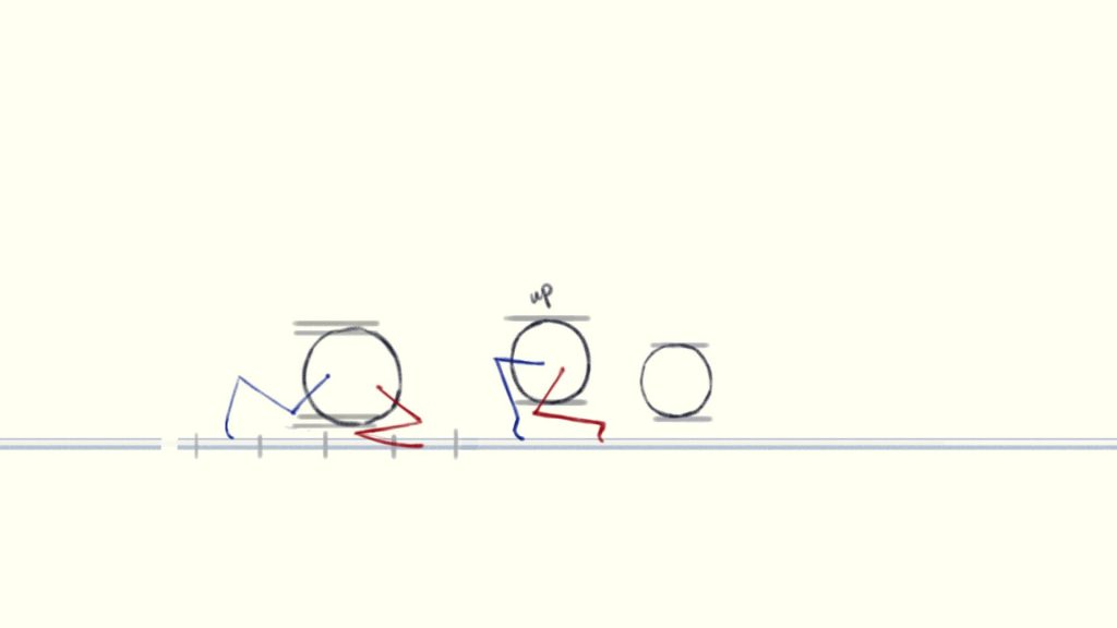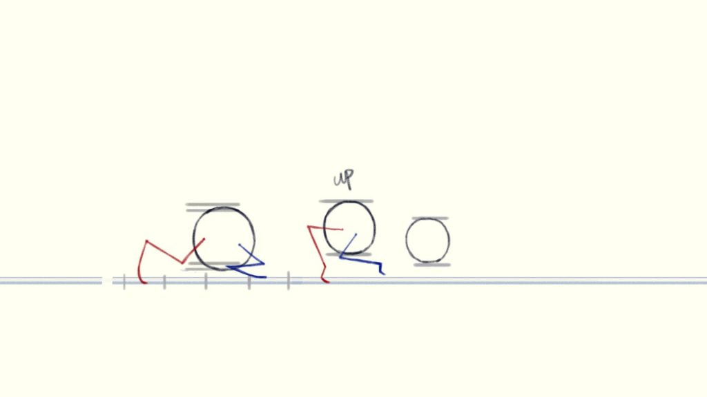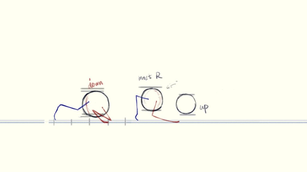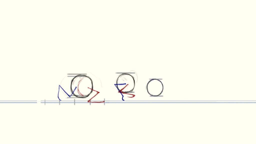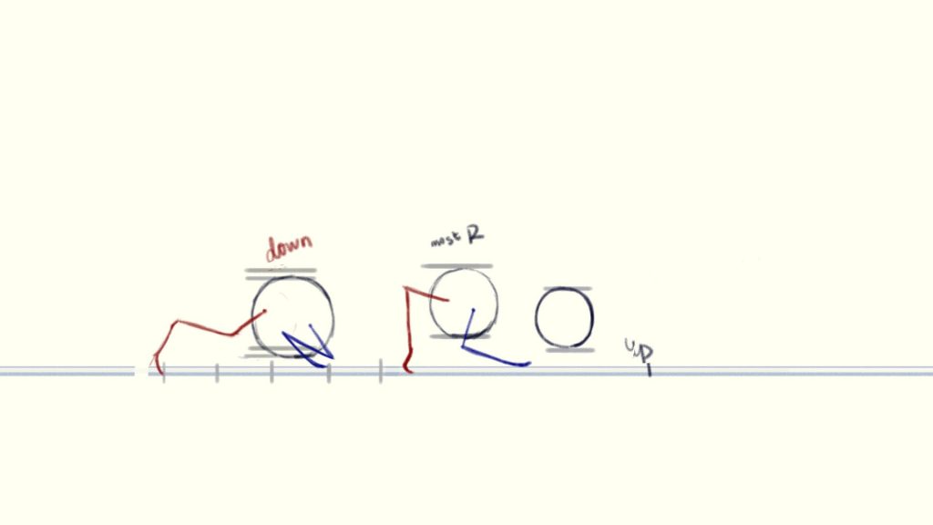 (The blue circle is the position where the charaster is standing at the beginning of the shot, the red circle is his final position and the yellow line is how he moves)