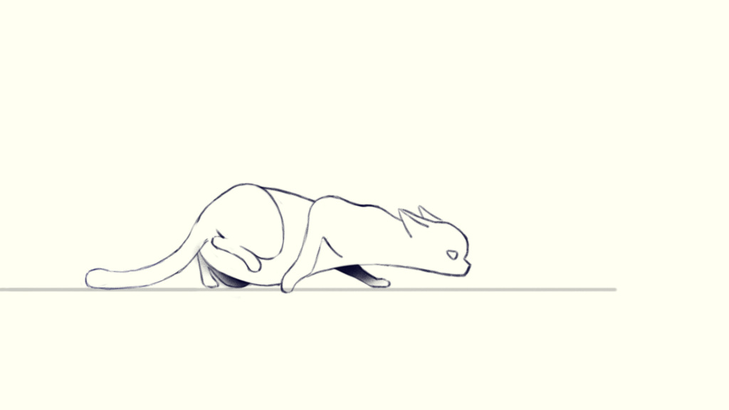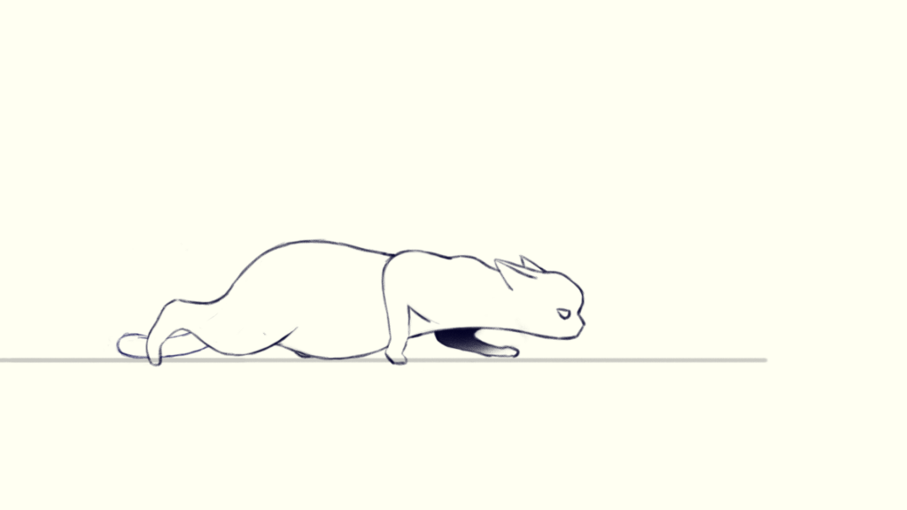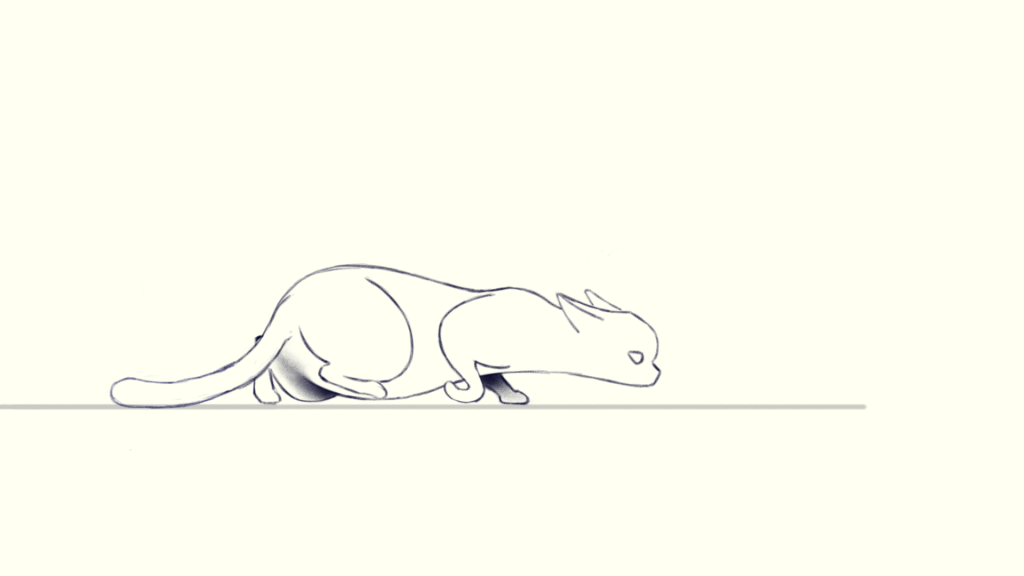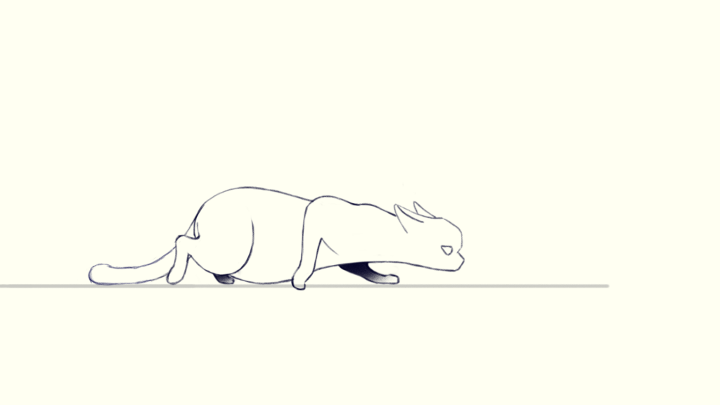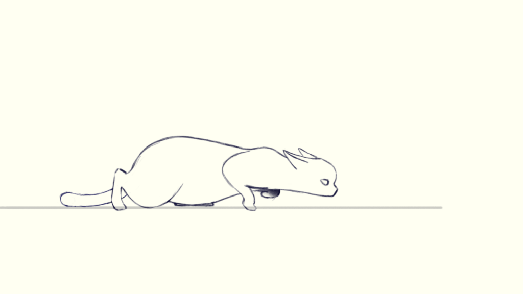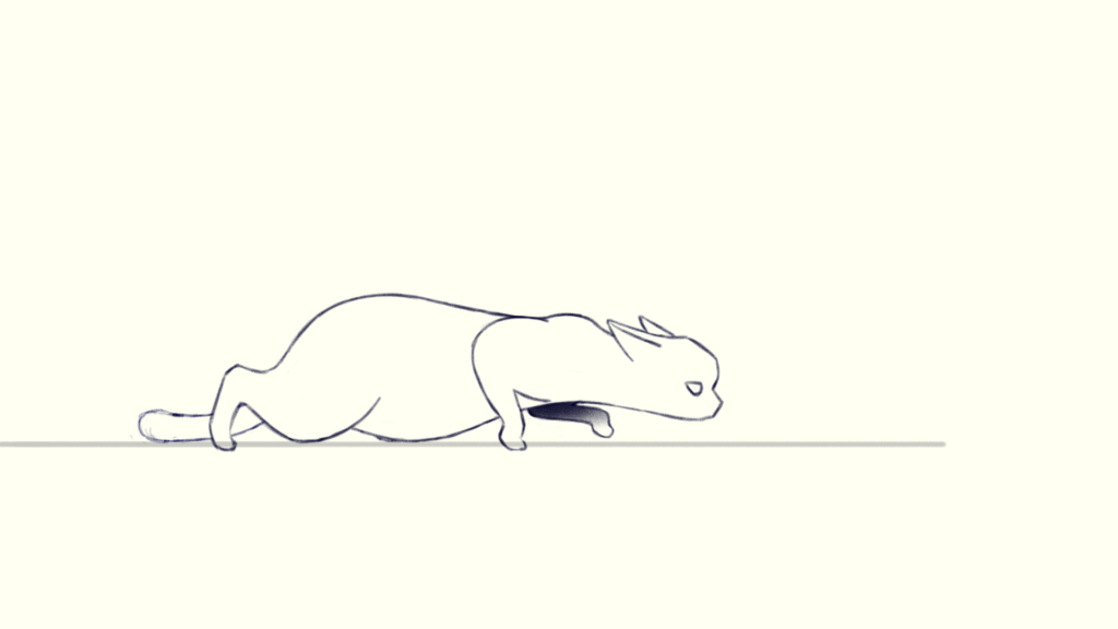Because the legs are bent and stretched severely, the body should be squashed and stretched during walking. After observing the reference in detail, I noticed that when one of the cat’s hind leg stretches backward and the front leg is ready to take a step, its body is stretched to its longest length, which is frame 3. So I drew the ribcage furthest to the left in frame 3 to show the body stretches mostly. Correspondingly, the ribcage should be the furthest to the left in frame 6.