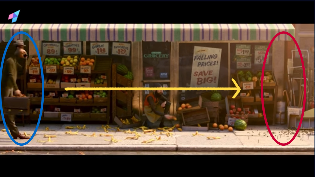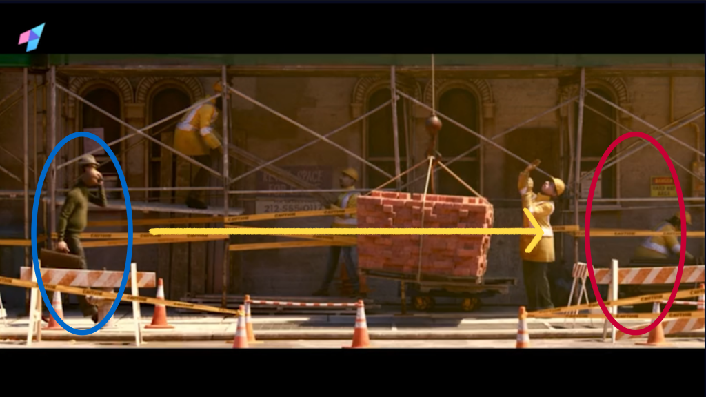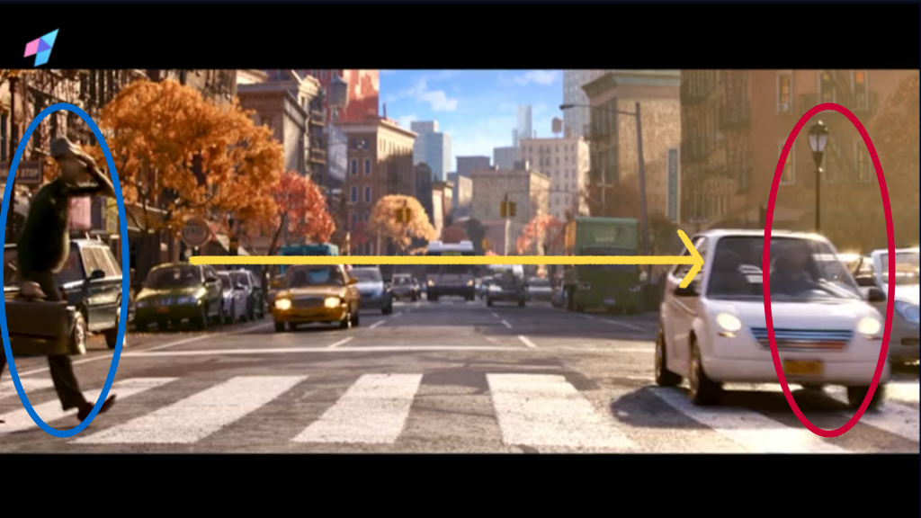 The another way applys when the character needs to go some direction for a long time, such as the group shots which the character walks several street blocks. So the character just enters the frame from the left side and exits from the right side, and next shot repeats this process until finish. The example is as follow: